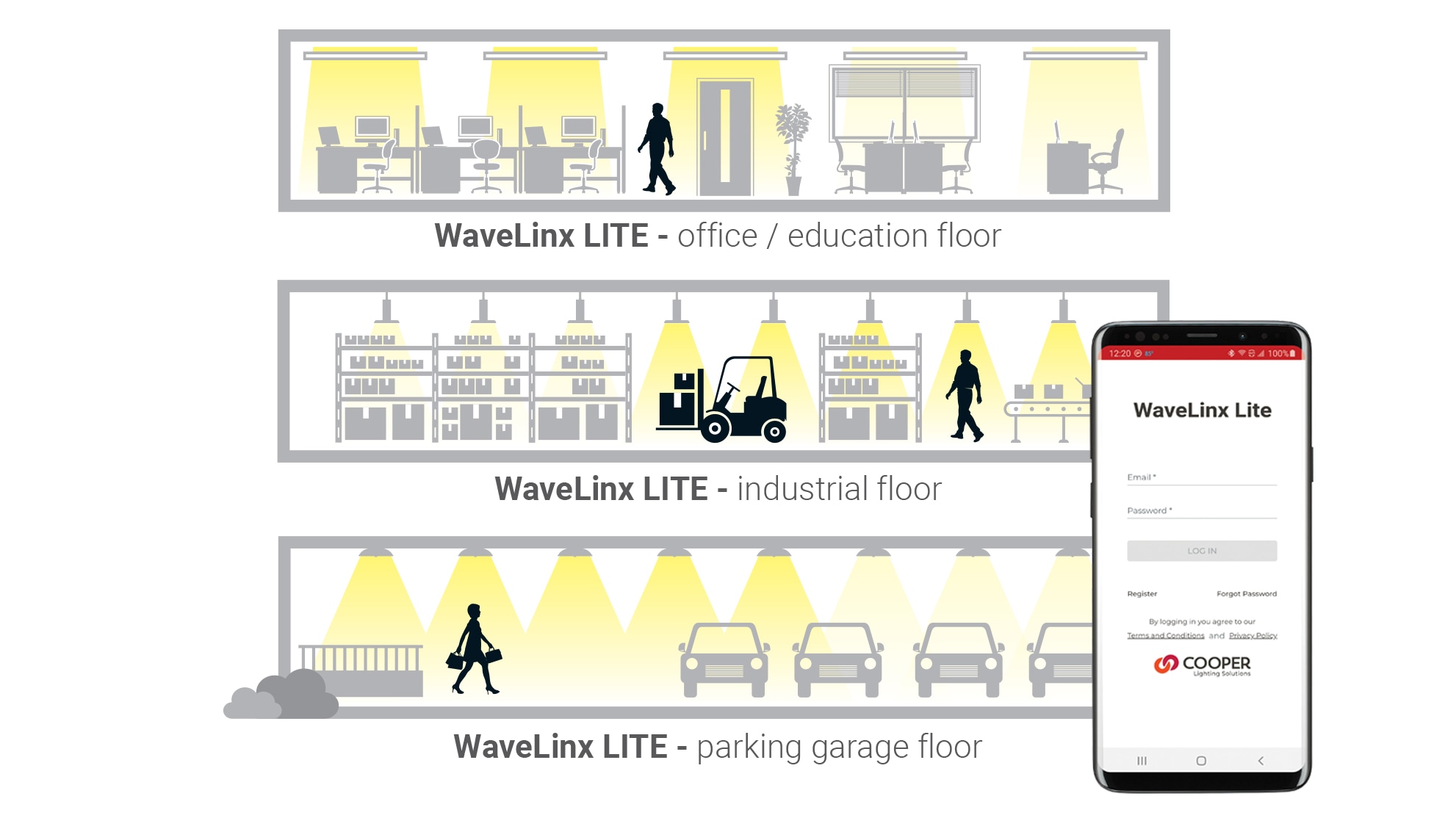 WaveLinx LITE is your out-of-the-box functionality app based smart digital lighting system that helps you save energy and manage your site lighting designed for applications that require occupancy-based, daylighting, or manual light control. A secure mobile application provides the ability to customize installations for your office, education, warehouse, and parking garage applications.