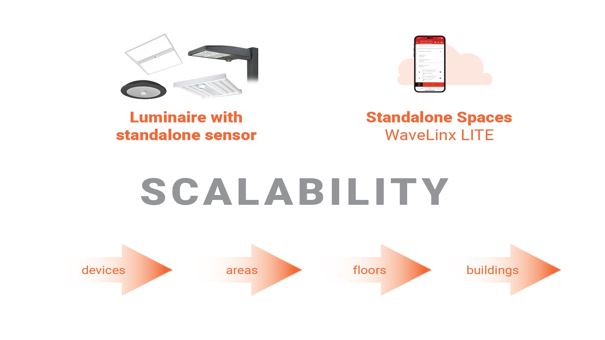 WaveLinx LITE solves traditional standalone problems all from a mobile app. Create groups without additional hardware (gateways, servers, etc.) or IT support required for light control site set-up.